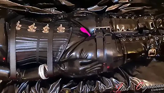 Budak seks-orgasme celeste diikat dengan lateks hitam dan kulit didorong untuk orgasme